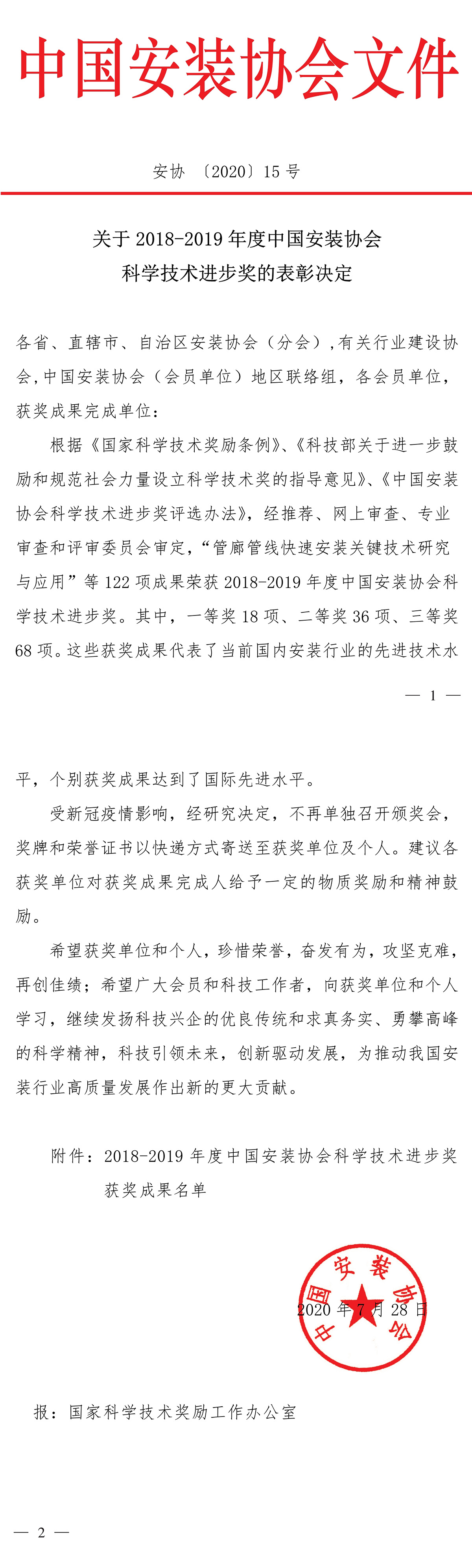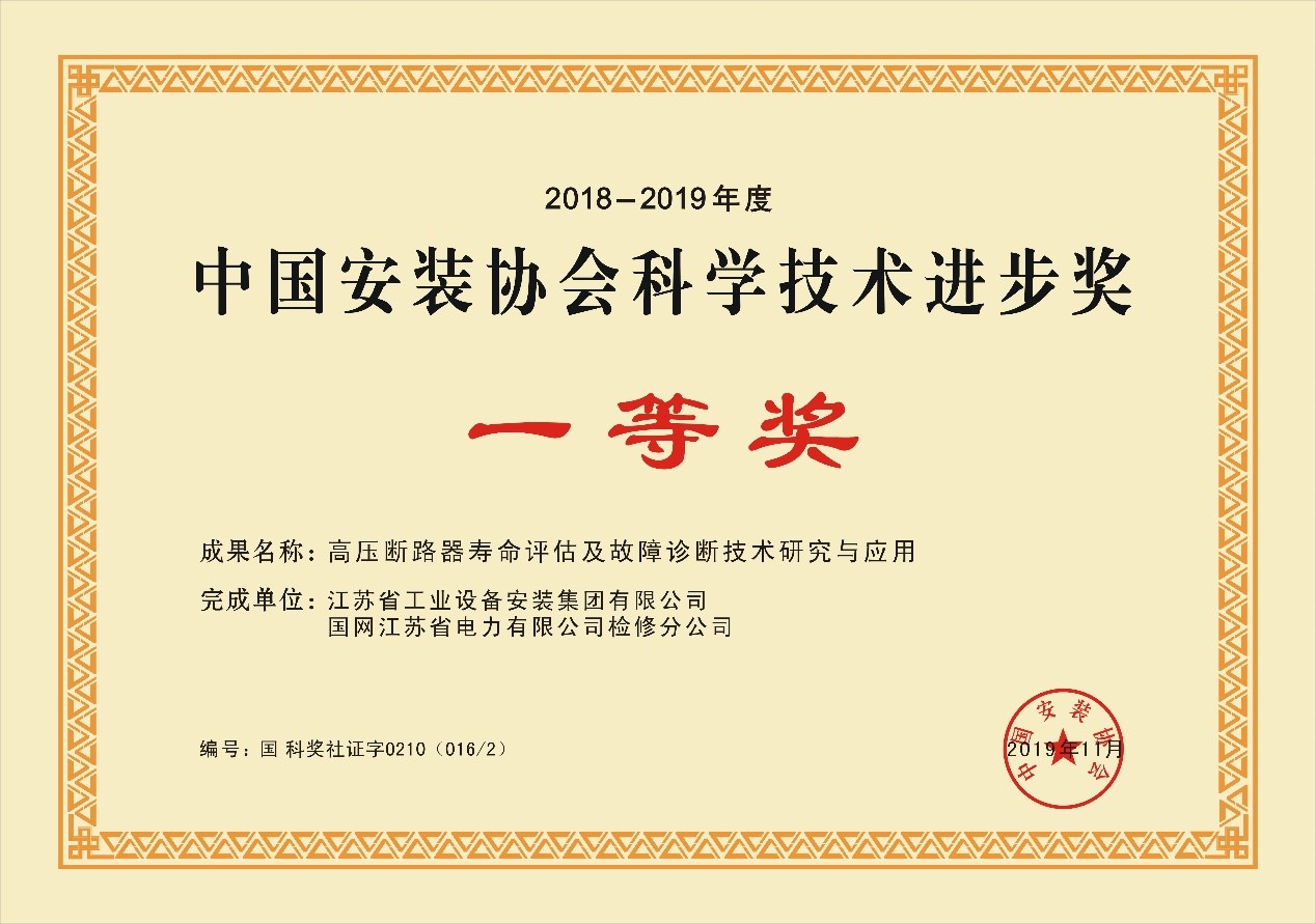 8月4日,中國(guó)安裝協(xié)會(huì)頒布了《關(guān)于2018-2019年度中國(guó)安裝協(xié)會(huì)科學(xué)技術(shù)進(jìn)步獎(jiǎng)的表彰決定》,江蘇省安申報(bào)的《高壓斷路器壽命評(píng)估及故障診斷技術(shù)研究與應(yīng)用》榮獲一等獎(jiǎng);《超長(zhǎng)距離復(fù)雜地層大直徑管道與光纜定向穿越技術(shù)》榮獲三等獎(jiǎng)。