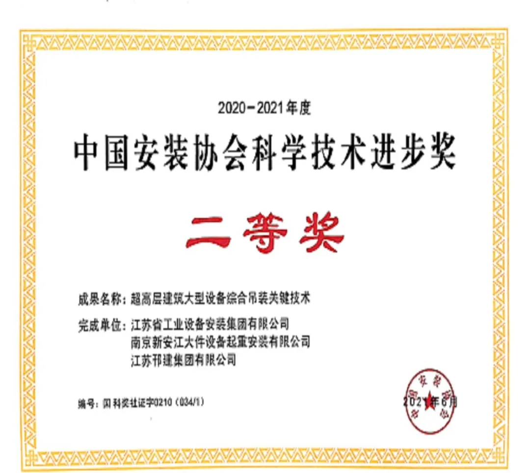 近日,科學技術進步獎表彰大會于南京國際青年會議中心落幕,江蘇省工業(yè)設備安裝集團有限公司申報的《超高層建筑大型設備綜合吊裝關鍵技術》榮獲2020~2021年度中國安裝協(xié)會科學技術進步獎二等獎。