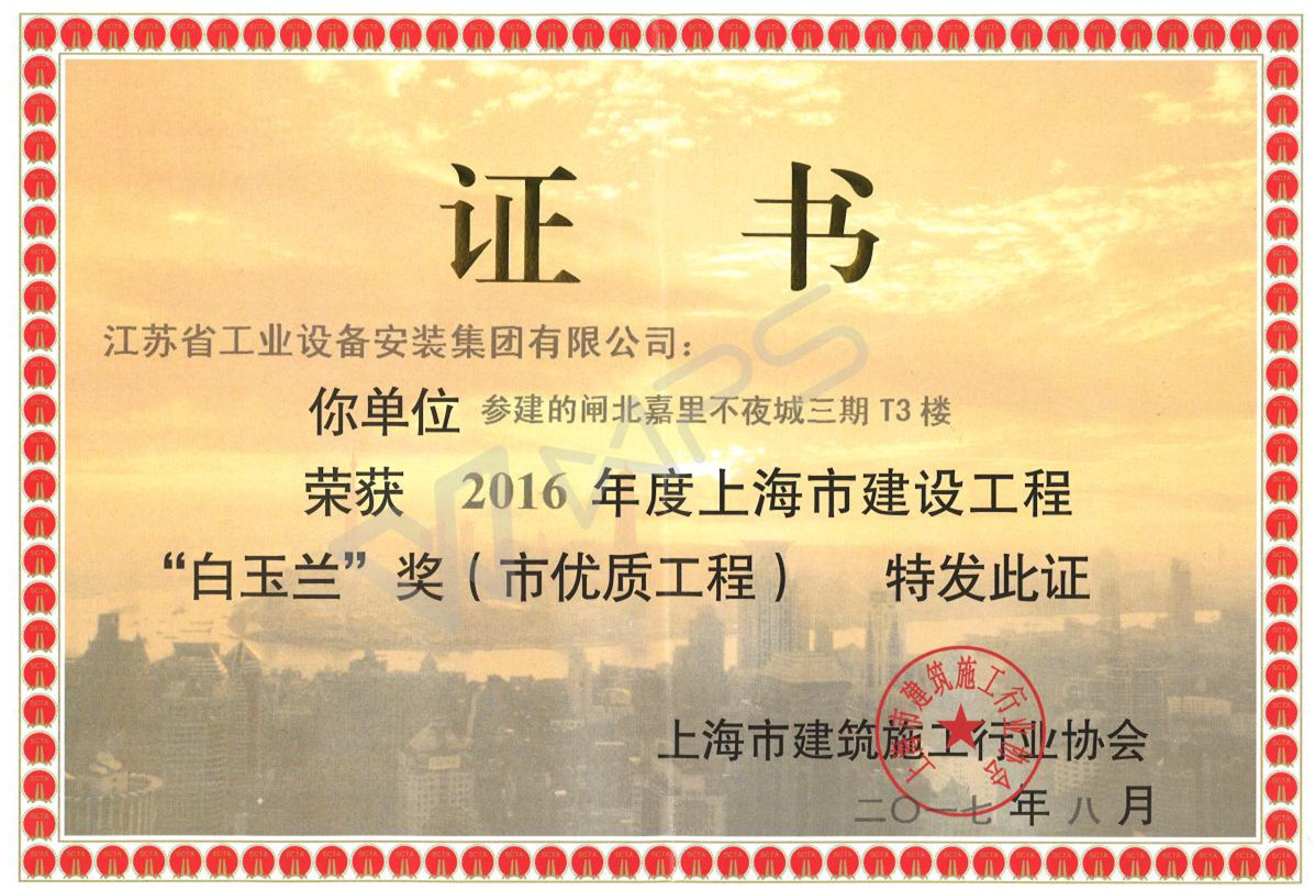 2016年12月,江蘇省工業(yè)設(shè)備安裝集團(tuán)有限公司通旺分公司參建的上海閘北嘉里不夜城三期T3樓項(xiàng)目成功入選上海市建設(shè)工程“白玉蘭”獎(jiǎng)(市優(yōu)質(zhì)工程),該工程經(jīng)過一冬一夏的使用考驗(yàn),無質(zhì)量問題,2017年8月正式頒獎(jiǎng)予以表彰。