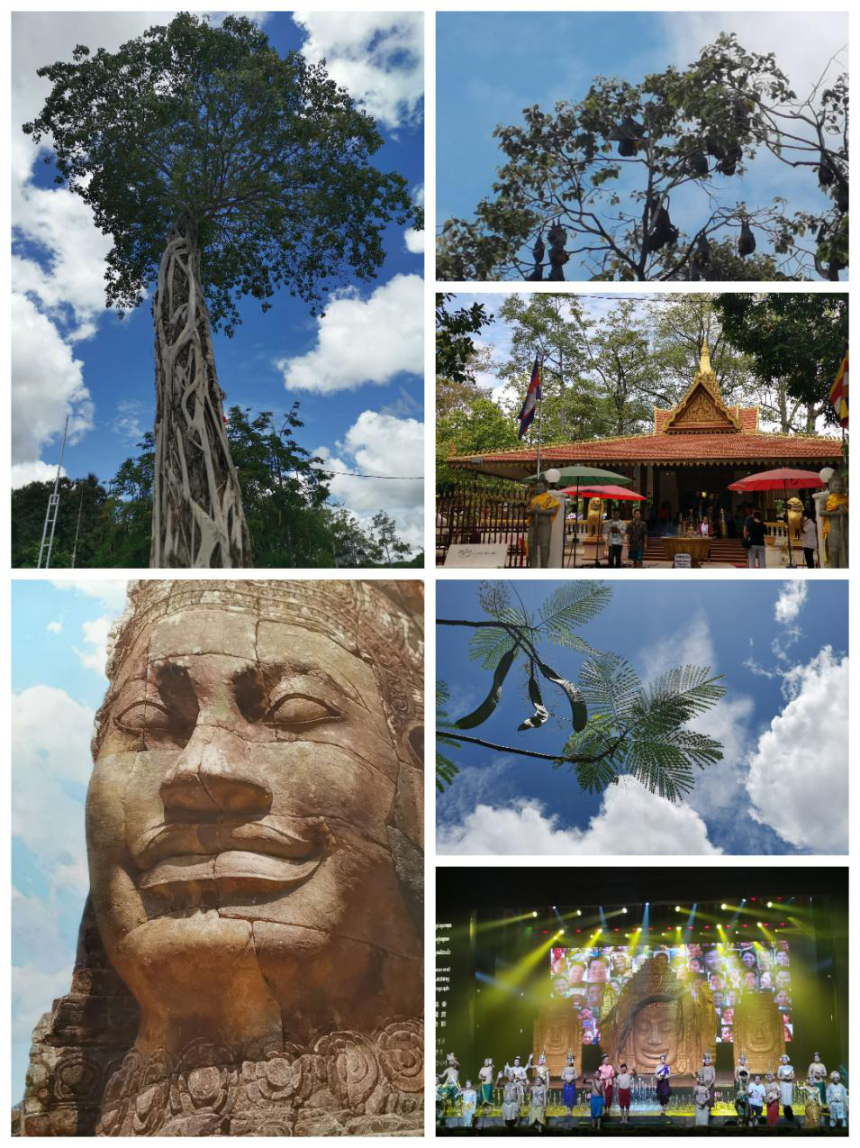 16日的行程很輕松,上午參觀了皇家公園、姐妹廟。皇家公園位于吳哥市中心,面積不大, 公園里面特別神奇的是,大樹(shù)上常年有巨大蝙蝠高掛在樹(shù)梢,彷佛相伴姐妹佛不舍離去,尤其是在清晨或是傍晚, 成千大蝙蝠盤(pán)旋空中的景象, 真叫人嘆為觀止。下午參觀了吳哥全景博物館,吳哥全景博物館是柬埔寨和朝鮮合作完成, 再現(xiàn)了吳哥的興衰,360度全景讓肉眼產(chǎn)生了錯(cuò)覺(jué),仿佛置身其中,很震撼!晚飯后欣賞了高棉民族舞蹈,演員們精彩的表演贏得觀眾陣陣掌聲。