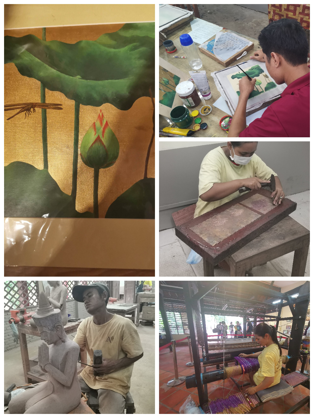 今天(18日)是在柬埔寨的最后一天,早晨睡到自然醒。之后參觀了一所技術(shù)學(xué)校,主要是為柬埔寨農(nóng)村人培養(yǎng)傳統(tǒng)的手工技能,如木雕、石雕、絲綢畫(huà)等。手工作坊較簡(jiǎn)漏,師傅門(mén)也沒(méi)有任何防護(hù)措施。