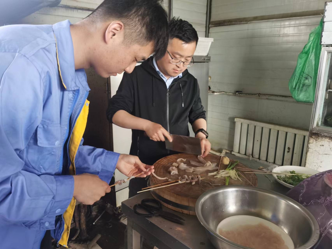 在領(lǐng)導的帶領(lǐng)下,我們一大早來到了菜市場,選取需要的肉和菜,將戰(zhàn)利品帶回項目部后,每個人都積極參與,洗肉-切肉-穿串,不亦樂乎。